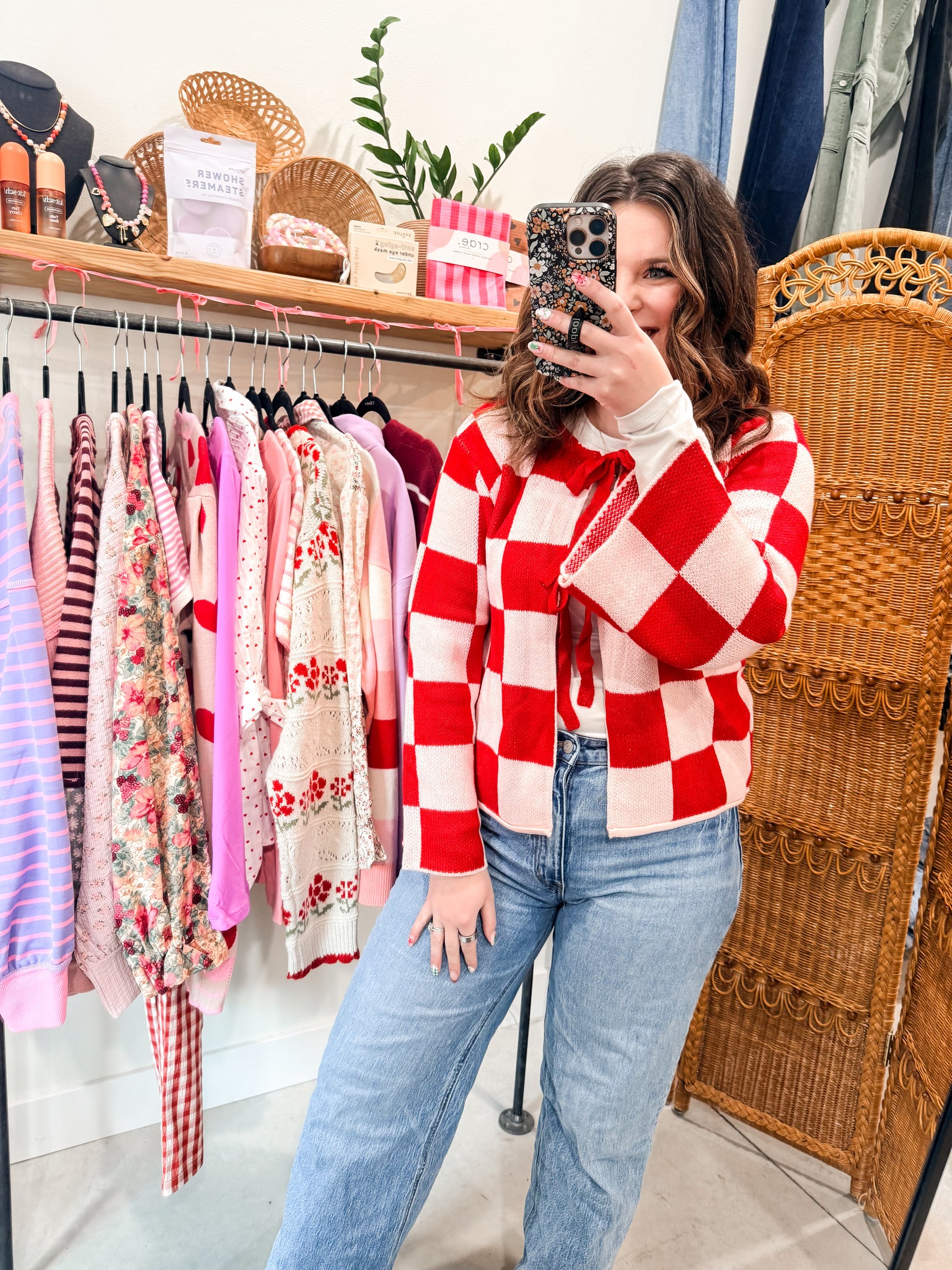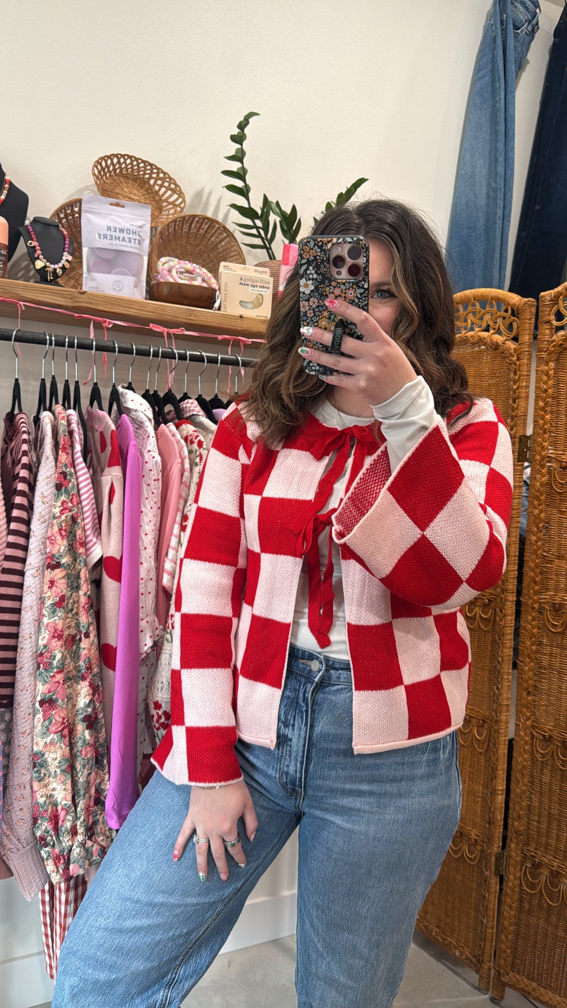 Red and blush checkered cardigan